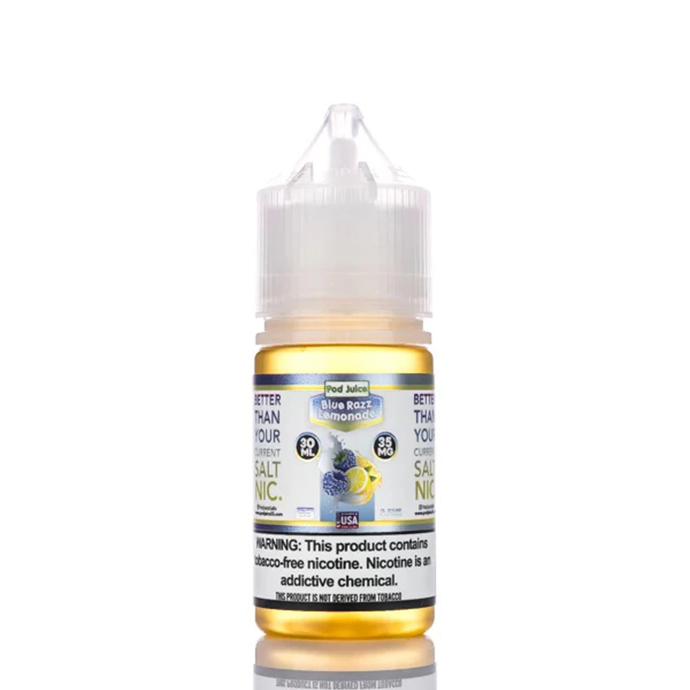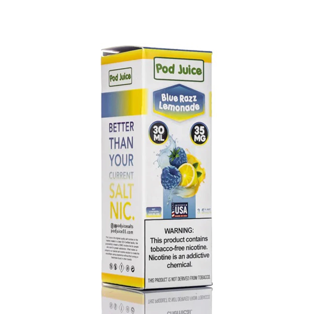 Blue Razz Lemonade by Pod Juice, capturing a delectable blend of tangy blue raspberry muddled in lemonade, made with synthetic nicotine salts.